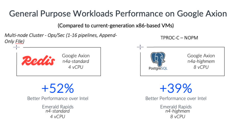 On two foundational cloud services, Redis – which powers fast in-memory caching and real-time analytics – and PostgreSQL – which underpins transactional systems across e-commerce, financial services, and web platforms – we have measured up to 52% and 39% better performance, respectively, on N4A compared to current-generation x86 N4 VMs.