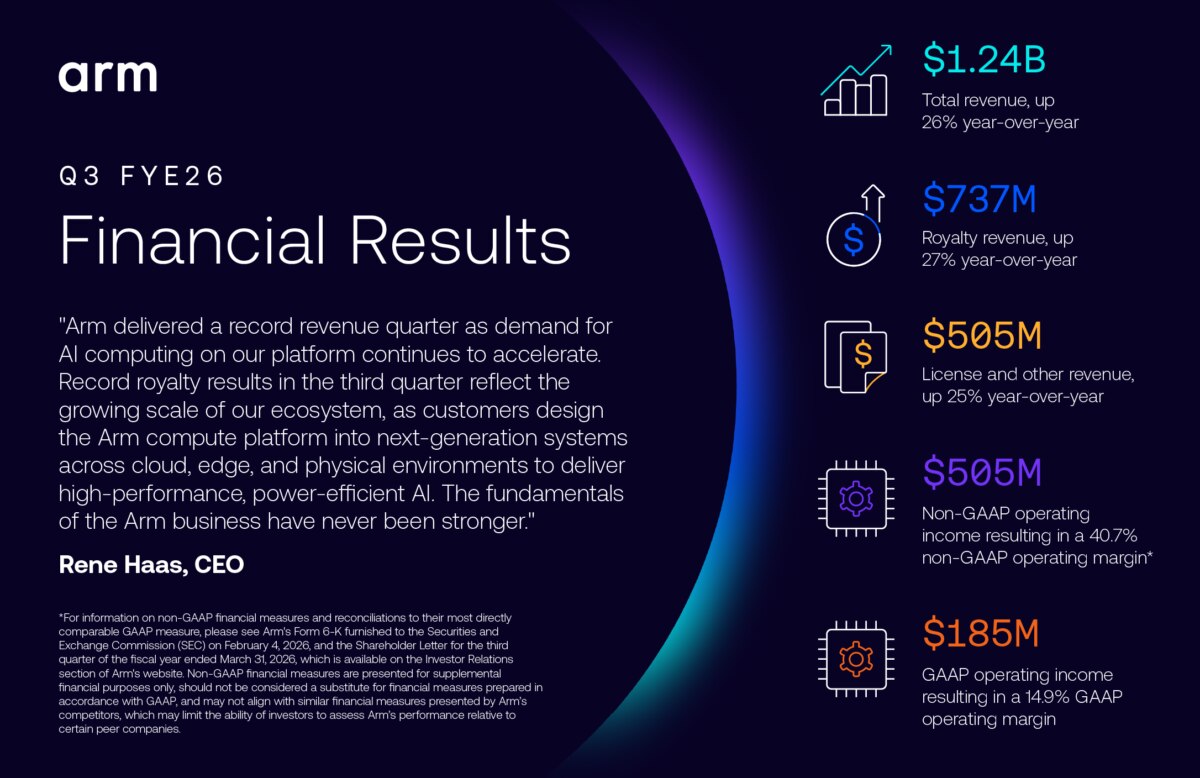 Today (Feb. 4, 2026) Arm (NASDAQ: ARM) published a letter to its shareholders containing the companyโs results for the third quarter of fiscal year 2026 ended December 31, 2025. The infographic below provides the key highlights: